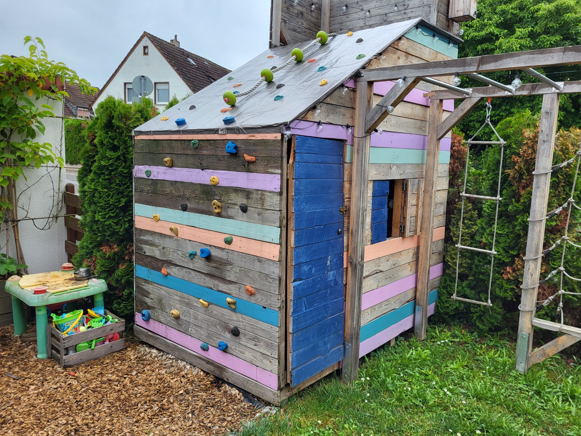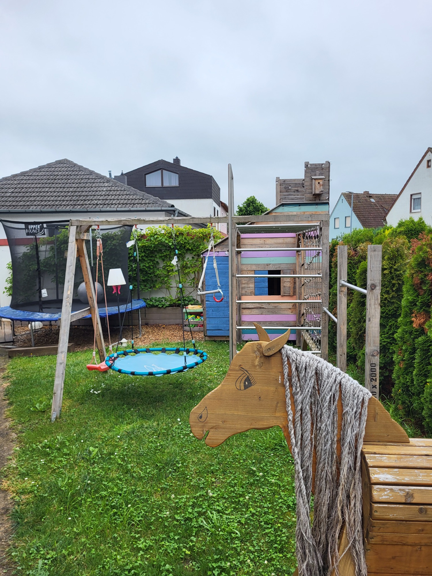 Unser tolles Seitengrundstück lässt keine Kinderwünsche offen. Hier gibt es ein Trampolin, einen Matschtisch, ein Klettergerüst mit verschiedenen Schaukelmöglichkeiten, eine Wippe und ein tolles großes Holzhaus mit einem Holzpferd davor. Unser Seitengrundstück lädt einfach zum Toben, Springen und Entdecken ein. Gleichzeitig wird auch die Kreativität der Kleinen durch die Vielzahl der Möglichkeiten immer wieder aufs Neue erweckt. Gerne rennen wir zusammen über das Trampolin oder üben uns vielleicht schon gemeinsam an einem Purzelbaum. Wir können aber auch ein Buch sowie ein paar Decken und Kissen mit ins Trampolin nehmen oder es uns bei einem Picknick darin ganz ruhig und gemütlich machen. Vielleicht nutzen wir auch das Große Holzspielhaus als Eisdiele oder füttern das Holzpferd, nachdem wir es gestriegelt und geputzt haben. Ich liebe die Bewegung, Kreativität und auch die Natur. All diese Aspekte möchte ich in vollen Zügen mit ihren Kindern erleben und genießen.